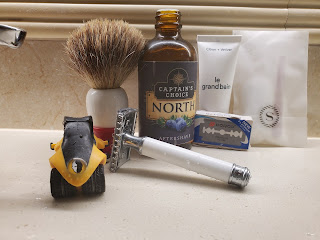 I used my fairly aggressive Muhle R102 razor with a Dorco ST300 blade. I found that the lather of the le grand bain shave cream had a nice slickness and did a good job protecting my skin. It effortlessly washed away; didn’t leave me feeling like my face was dried out; or that I was in a cologne showroom. All in all, a pleasant experience.
